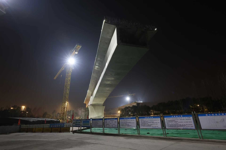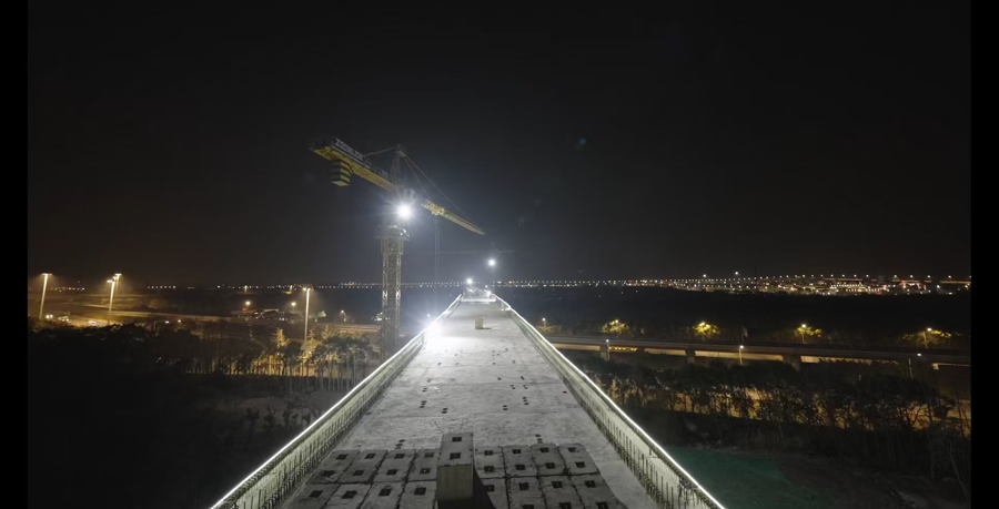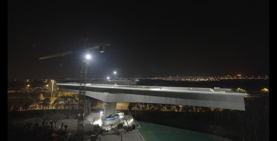 为攻克技术难题,项目团队联合磁浮线运营、交通管理等单位创新建立“磁浮安全守护”联动机制,采取“天窗点精准施工+实时动态监测”管控模式,将转体作业严格限定在运营间隙,并全程同步监测轨道沉降与振动数据,确保对磁浮线“零影响”。面对大重量、高精度转体要求,团队运用智能连续转体系统,结合“模拟预控+实时校准”数字化方案,通过BIM技术预先模拟施工全过程,精准测算牵引力与转体速度;转体过程中,采用4台智能连续转体千斤顶同步牵引,配合千分表、全站仪等设备实时监测,最终将梁体轴线偏差控制在5毫米内,合龙接口误差小于2毫米,实现平稳精准转体。