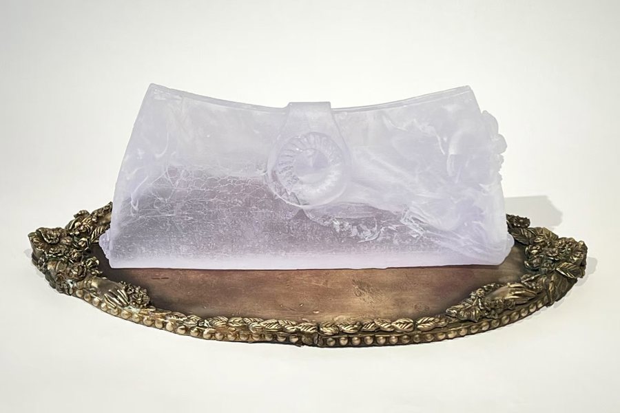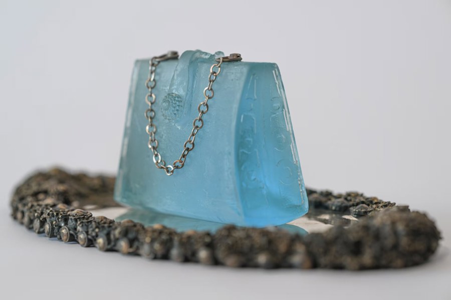 《她的完美小手包》这件作品就展现了布拉齐娜借玻璃用来保存时间的片段,展现记忆与个人的链接,搭配青铜托盘展示,这是一件关于“珍藏”的作品。布拉齐娜说,我维承了祖母的手袋,在祖父拍摄的照片里祖母正拿着它。照片与手袋对应着回忆——一位记录了那个瞬间,一位则将它传承了下来,微小的日常碎片在玻璃与光的加持下,都拥有了时间的重量。